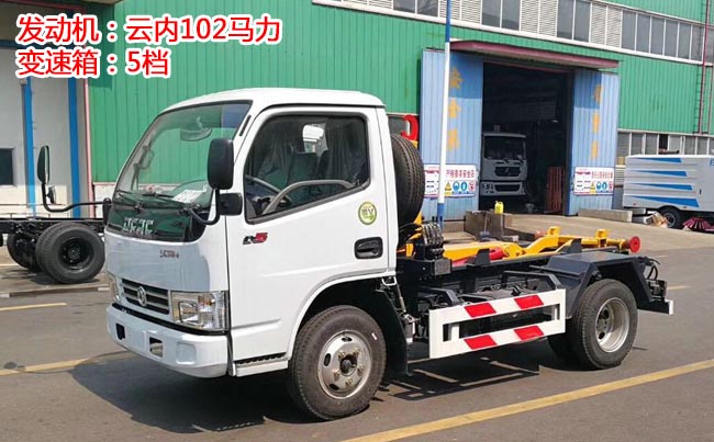配套5~6立方米勾臂垃圾箱,高強(qiáng)度主勾臂,雙液壓油缸,采用國產(chǎn)油泵、多路閥、油缸,駕駛室外操作,尾部帶滾輪,箱體鎖緊裝置,鎖緊后可實(shí)現(xiàn)垃圾車自卸。