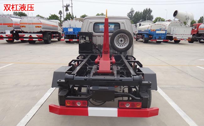 配套2~3立方米勾臂垃圾箱,高強度主勾臂,雙杠液壓,采用國產(chǎn)油泵、多路閥、液壓油缸、車身顏色根據(jù)客戶要求更改,尾部帶鎖緊裝置、滾輪。