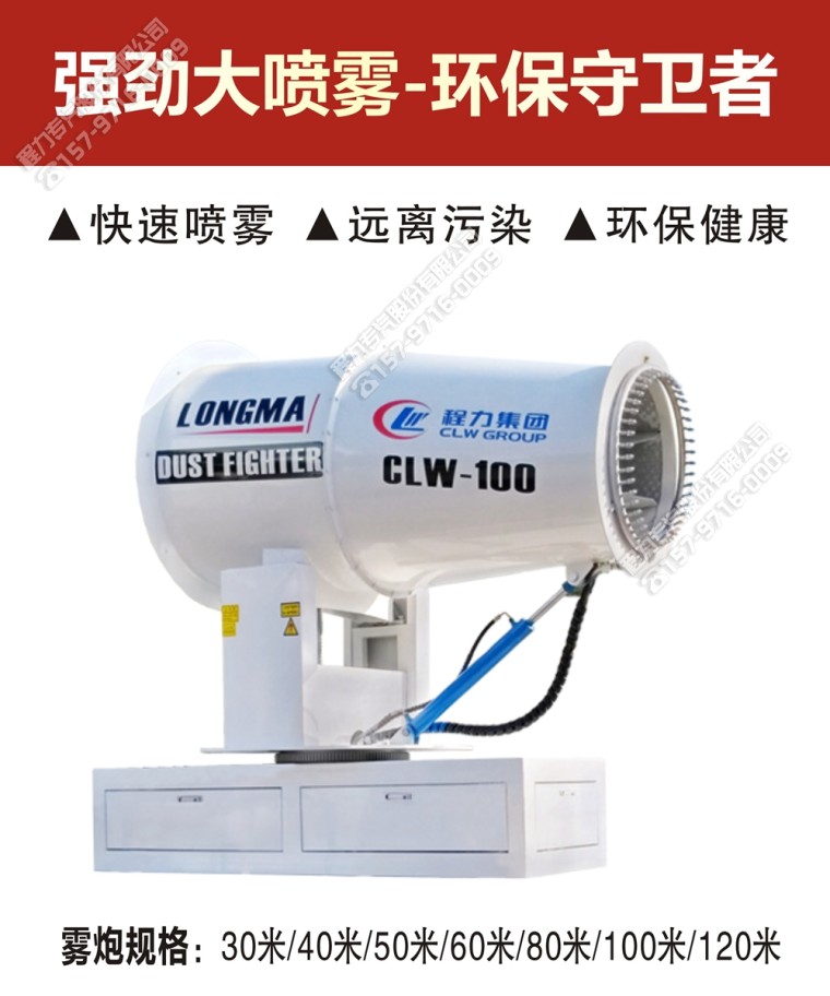 東風霧炮車霧炮參數:CLW-100型80米,副發電機組功率75(Kw),風機功率18.5(Kw),不銹鋼多級離心泵功率7.5(Kw)。100米無線遙控操作,霧化距離80米(靜風室內距離)實際射程:(霧化射程會受濕度、溫度、風速等各方面天氣因素的影響,另外天氣干燥地區一部分在空中被蒸發掉)。