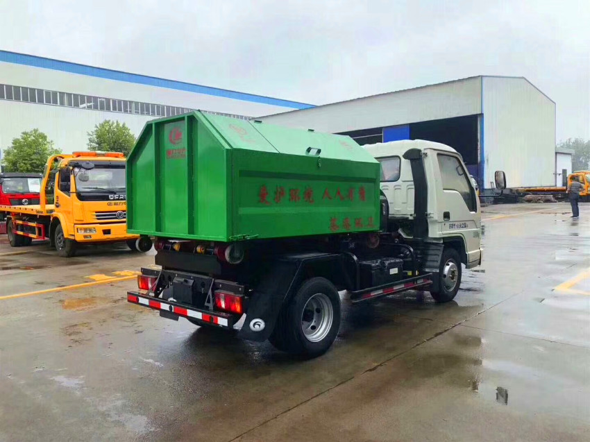 采用國標碳鋼3mm板材制作,采用武鋼產Q235-A型。 帶電磁取力,齒輪泵,液壓油缸,廂體兩側開門,帶液壓撐桿,后門帶密封條,帶鎖緊裝置,四角帶滾動輪,可自卸。采用好質量油漆,車廂外部做防銹處理,車身油漆為白色,垃圾箱為上白下藍。福田勾臂式垃圾車底盤配置:
