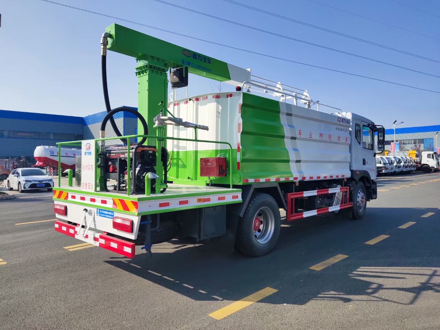 多功能抑塵車主要結構是在行走機構上加裝方型大容積水罐、高效遠程霧炮系統、大功率專用自吸自排水泵,中低壓沖洗灑水系統、綠化灑水高炮(可選裝自動灑水高炮,在罐體前端)等等而改裝組成。、罐體容積大(14立方),免征產品