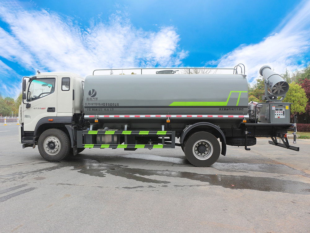 二.產品配置 1.底盤配置: 發動機玉柴 245 馬力(六缸),法士特 8 檔,3950 軸距,10.00 鋼絲胎,前 4.5T/后 10T,中控鎖,電動玻璃,助力,空調,行車記錄 儀2.上裝配置: 1、罐體約為 12 方,可加裝 30-40 型霧炮 2、邊燈帶電,罐體尾部上方標配 2 個紅色示寬燈, 3、標配前噴為鴨嘴直沖,標配后沖,用戶可根據自己的需求,來調 整對沖位置。 4、花紋防滑平臺,炮筒后蓋為定制型螺栓卡扣, 5、前噴、后沖、后灑、側噴,綠化高炮開關球閥均采用 50 大通經 不銹鋼球閥, 6、新式軸承式水炮,更加耐用, 7、60-90 型水泵, 8、防腐法蘭墊片, 9、鋁制后灑,不易炸開 10、罐體自動焊(美國林肯焊機及電源),拼板自動焊接,封頭環 縫焊接,無氣孔,焊縫美觀。 11、側護網、后保險杠、均為螺栓連接,方便拆卸,維修方便。 12、塑料擋泥板,替代鐵擋泥板,更加輕便,用螺栓連接,方便拆 卸。 13、前部、后部主管連接處為 6 孔圓法蘭,不易沖墊